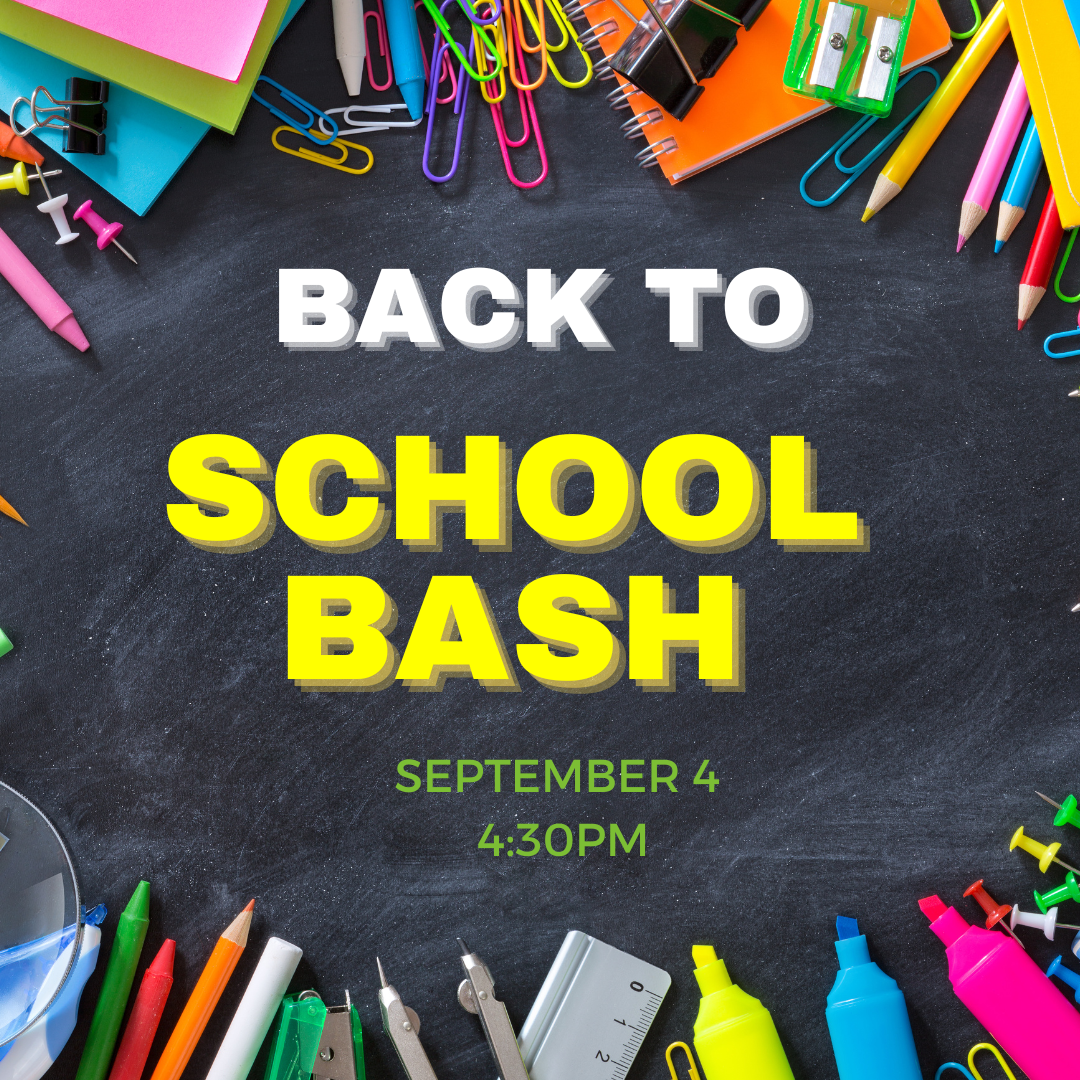 Chalk board with colorful school supplies and the words "Back to School Bash"